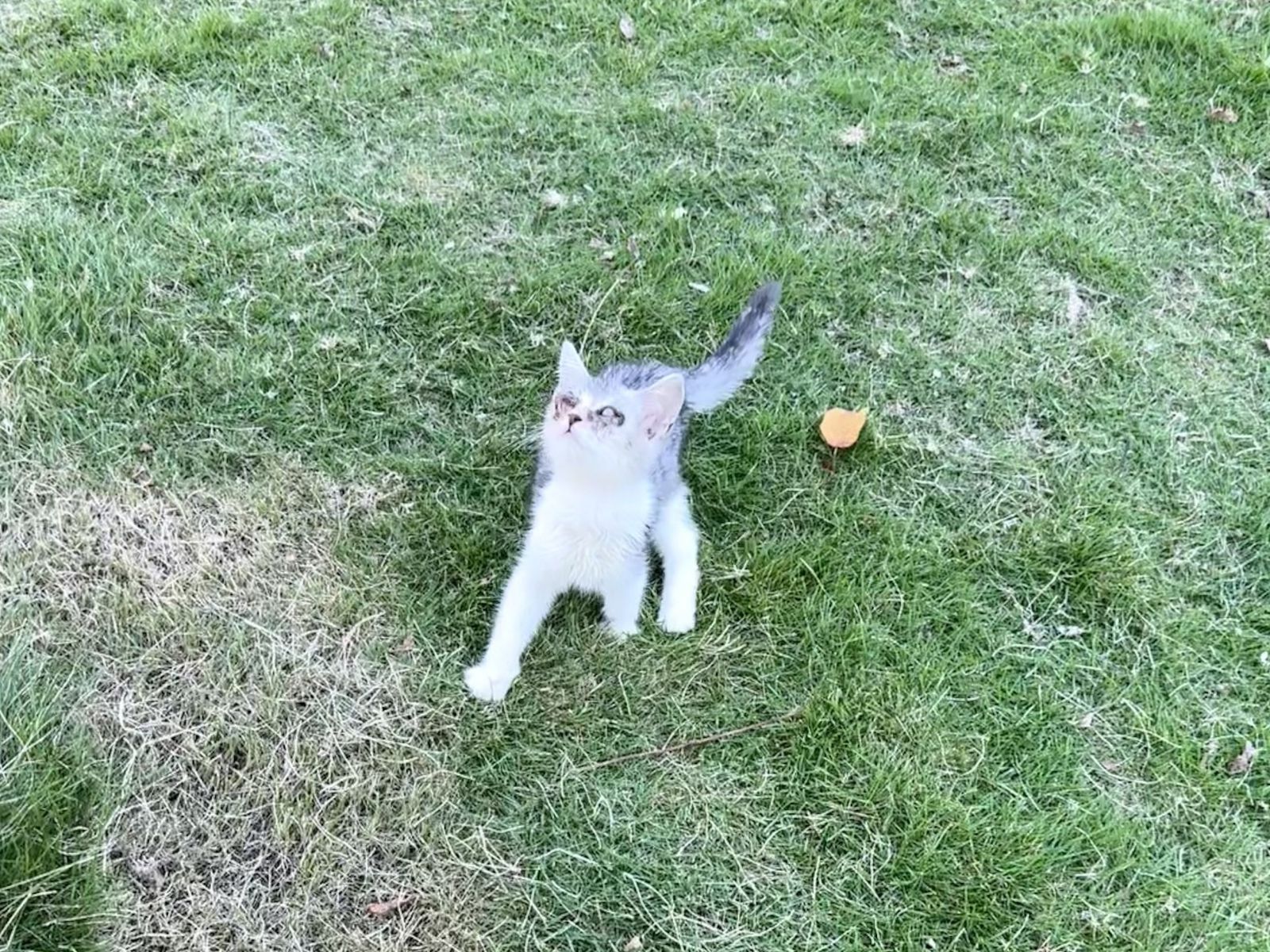 花生的世界本已一片狼藉,食盆里、水盆里、脚下,到处都是它不小心打翻的水和踩到的猫砂,浑身常常湿漉漉的,更显凄凉。我们不忍将它放在隔离笼里,于是,每天带它去草坪感受阳光,追逐落叶。