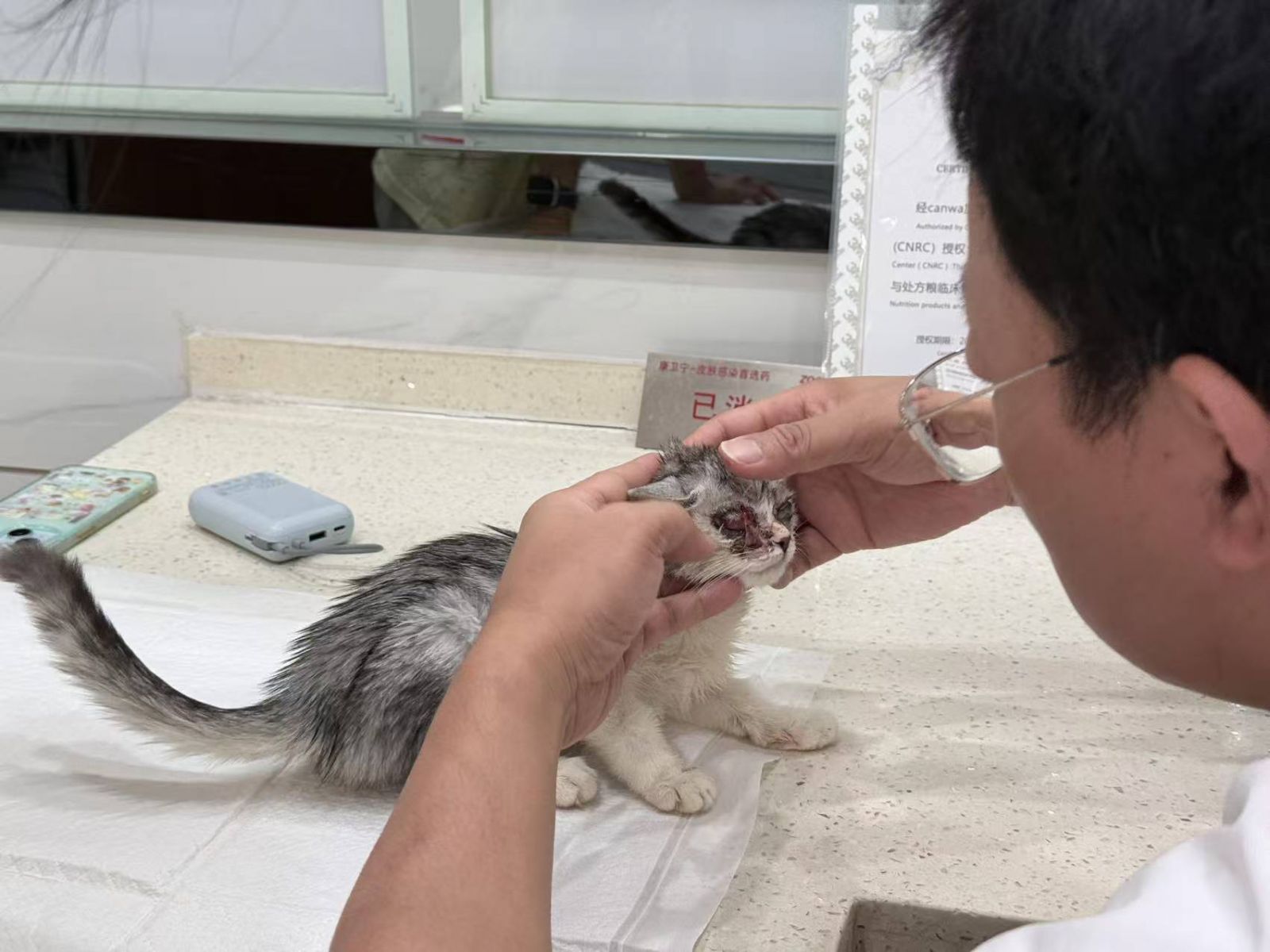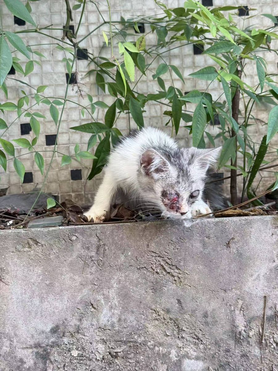 发现花生时,情形令人心碎。在杂乱不堪的草丛里,这只虚弱的小猫正发出微弱的哀鸣。它的双眼严重溃烂流脓,生命被笼罩在一片厚重的迷雾中。因为失明,花生感知世界的方式,只剩下焦灼的嗅觉与触觉,它疯狂地四处嗅闻,试图定位近在咫尺的猫粮,小小的脑袋无助地左右转动,每一次与食物的“错过”,都让它更加惊慌与饥饿。