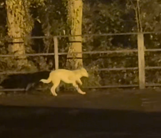 它带着我们一遍遍在深夜的停车场里找来找去,直到商贩都准备打烊了,它也没有放弃(我手里那仅剩的半根火腿肠)。突然停车场靠近森林的角落里一个白影出现,我知道那就是小白。按捺住内心的狂喜和不安,是时候派出了我在武隆唯一的朋友小倩了。小倩这个朋友是值得交的,收钱(火腿肠)是真办事,它自告奋勇的冲上去,带着小白就往停车场中间走,只有哪里才有躲着吹麻的机会。但真的是好事多磨,一辆大巴停了进来,车上下来的司机和导游小姐姐又看见了受伤的小白,要再次上去捉它。惊吓后的小白向森林逃去,我和敏姐也只能分头拦截了。好消息是在小白快逃进森林前,敏姐抓住了最后的机会,坏消息是小白逃进了森林。