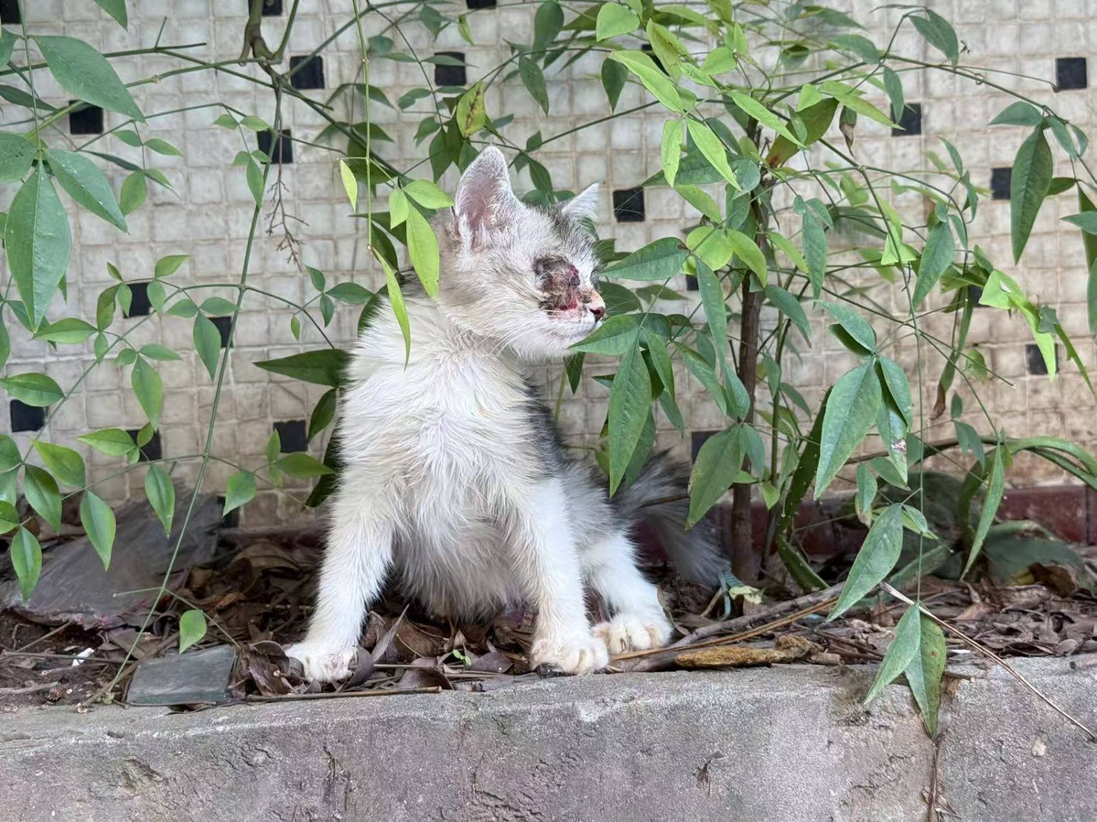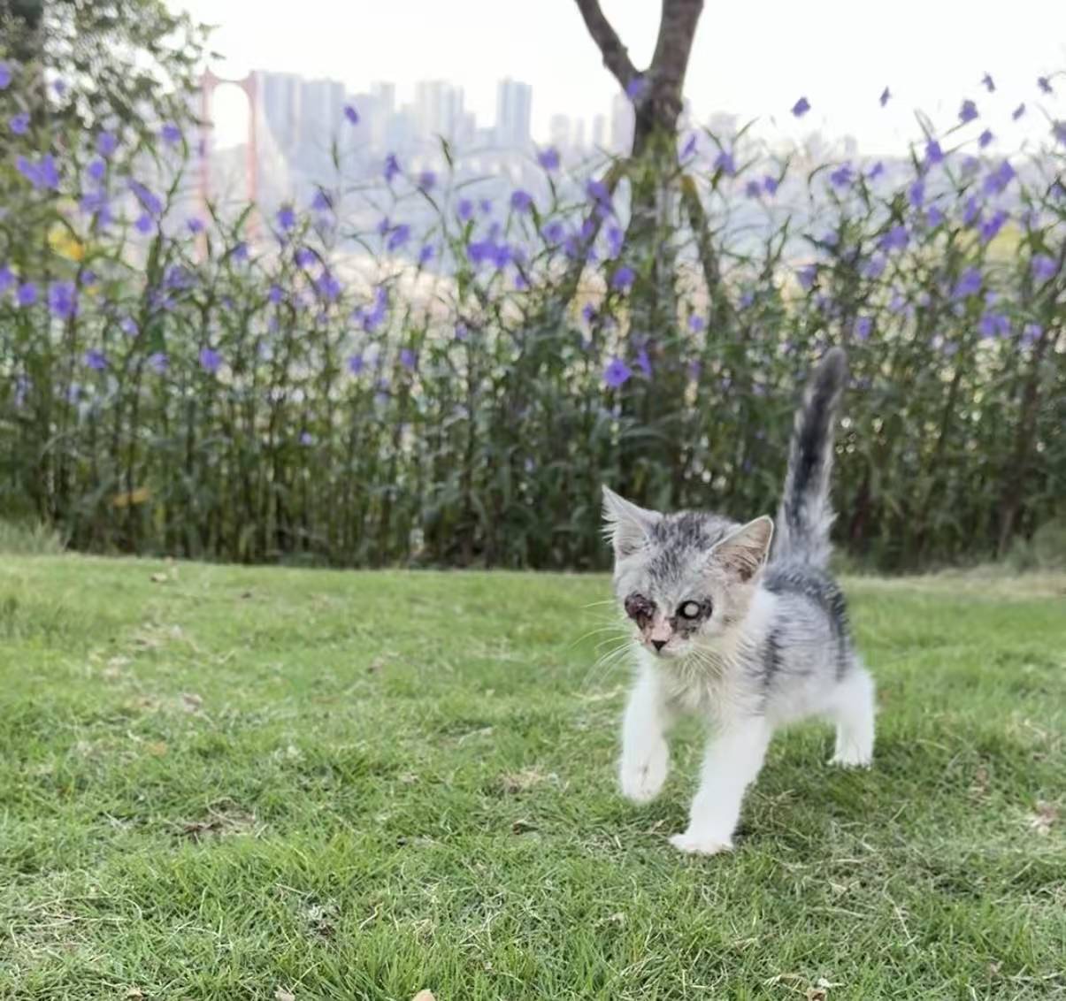 发现花生时,情形令人心碎。在杂乱不堪的草丛里,这只虚弱的小猫正发出微弱的哀鸣。它的双眼严重溃烂流脓,生命被笼罩在一片厚重的迷雾中。因为失明,花生感知世界的方式,只剩下焦灼的嗅觉与触觉,它疯狂地四处嗅闻,试图定位近在咫尺的猫粮,小小的脑袋无助地左右转动,每一次与食物的“错过”,都让它更加惊慌与饥饿。