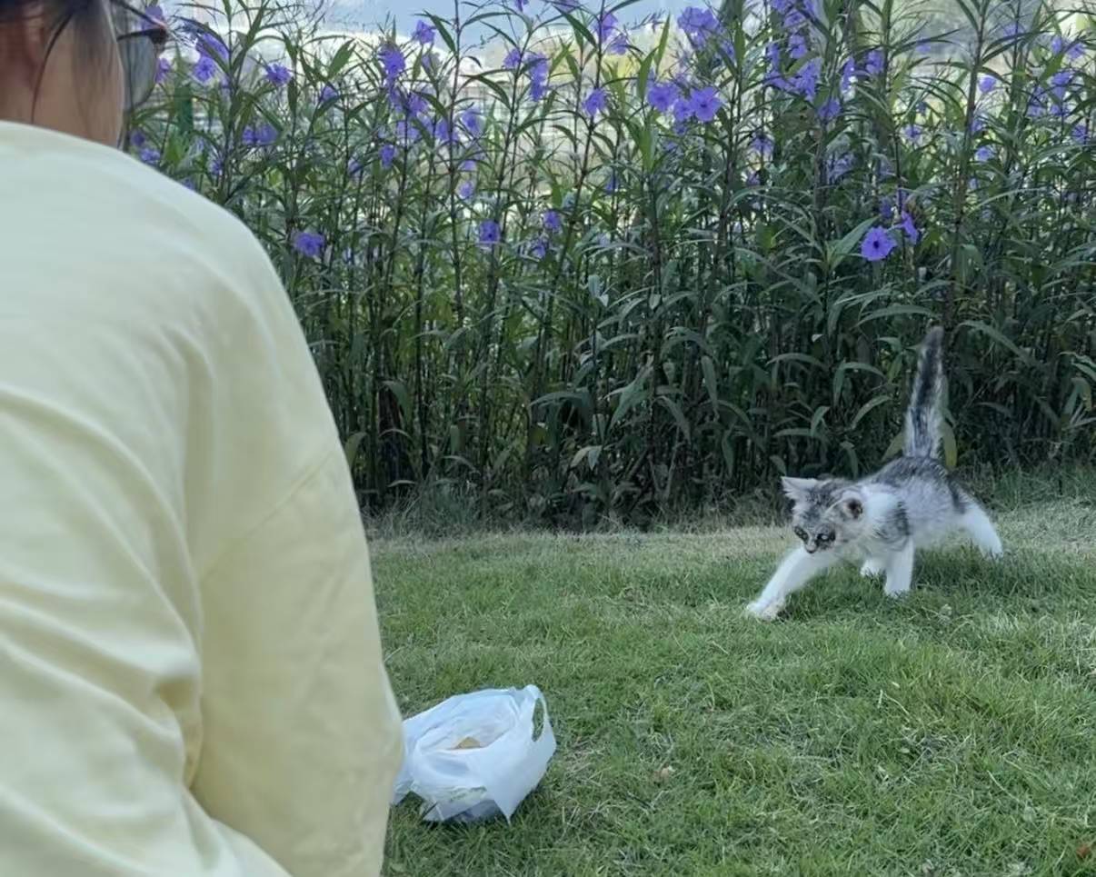 花生的世界本已一片狼藉,食盆里、水盆里、脚下,到处都是它不小心打翻的水和踩到的猫砂,浑身常常湿漉漉的,更显凄凉。我们不忍将它放在隔离笼里,于是,每天带它去草坪感受阳光,追逐落叶。